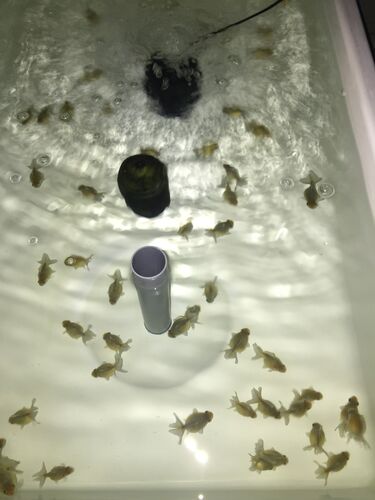 孵化後28日目の稚魚の様子です。 ブラインをまだまだ与えています。 まだまだ数も多く孵化後の日数のわりにはだいぶ小さな稚魚たちです。 次は孵化後61日目の稚魚たちです。 夜の水換え時の写真です。フラッシュをたいていますので少しぼやけています。毎日…