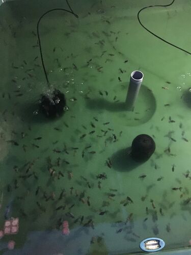 孵化後45日目の黒青竜稚魚。 大き目容器で数を残して止め水飼育をしている黒青竜の稚魚たちを2週間ぶりに水換えしました。 写真が非常にぼけています。すいません。夜の水換えでした。餌は朝晩に2回冷凍ミジンコを2枚と間にフードタイマーにてらんちゅうディ…